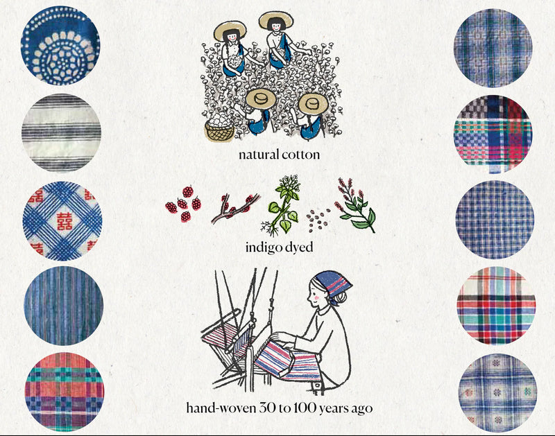 Tu-Bu refers to vintage handwoven fabrics made 30 to 100 years ago by farming families along the Yangtze River — from growing cotton, spinning yarn, natural dyeing, to weaving. These fabrics are no longer produced today. Each piece is unique, with a raw cotton texture and tightly woven strength, originally made as dowry gifts from mothers to daughters.